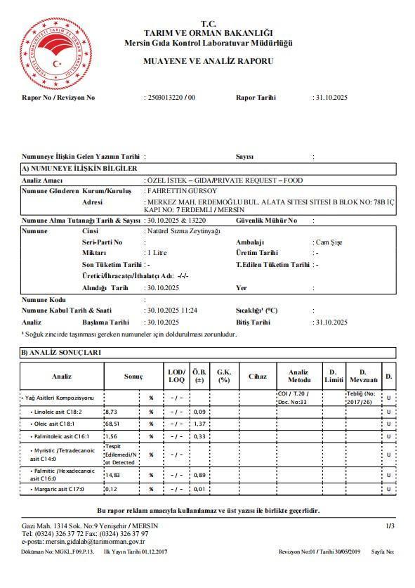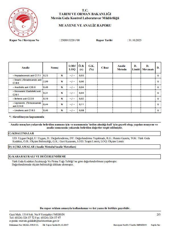 Bu açıklama raporu, yukarıda bilgileri verilen natürel sızma zeytinyağı numunesine ilişkin olarak Mersin Gıda Kontrol Laboratuvar Müdürlüğü tarafından gerçekleştirilen yağ asitleri kompozisyonu analizinin teknik değerlendirmesini içermektedir. Analiz, Türk Gıda Kodeksi Zeytinyağı ve Pirina Yağı Tebliği (No: 2017/26) hükümleri esas alınarak gerçekleştirilmiştir. Rapor, yalnızca incelenen numuneye ait olup, farklı partiler veya üretim tarihleri için genelleme yapılamaz.