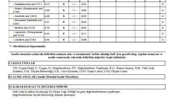 Yapılan kimyasal analizler sonucunda, numuneye ait yağ asidi bileşiminin Türk Gıda Kodeksi Zeytinyağı ve Pirina Yağı Tebliği (2017/26)’ya uygun olduğu tespit edilmiştir. Bu sonuca göre numune, natürel sızma zeytinyağı sınıfında değerlendirilmiştir.